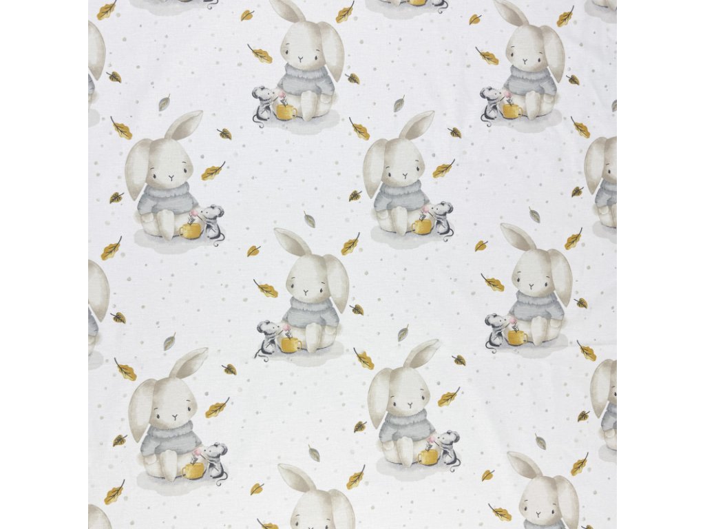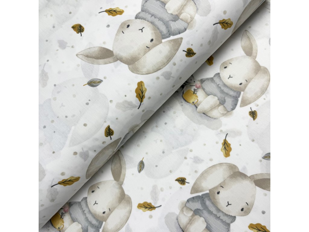 Bavlněná látka šíře 240 cm - Zaječí pohádka (28313-6) je skvělá volba pro kreativní projekty, které vyžadují kvalitu a estetiku. Tato látka zaujme svým půvabným motivem roztomilých zajíčků oblečených v šedých svetrech, kteří se nacházejí v kouzelném prostředí plném myšek s hrníčky a drobných detailů, jako jsou žluté a hnědé lístky. Látka je vhodná na šití ložního prádla, dětských závěsů, povlaků na polštáře, oblečení nebo jiných dekorativních výrobků. Díky šířce 240 cm poskytuje dostatek materiálu pro velké projekty. Vyrobená z kvalitní bavlny, která je měkká na dotek a snadná na údržbu, zajišťuje dlouhou životnost a komfort. Skvělá volba pro každého, kdo chce vnést do interiéru hravost, útulnost a jedinečný styl.