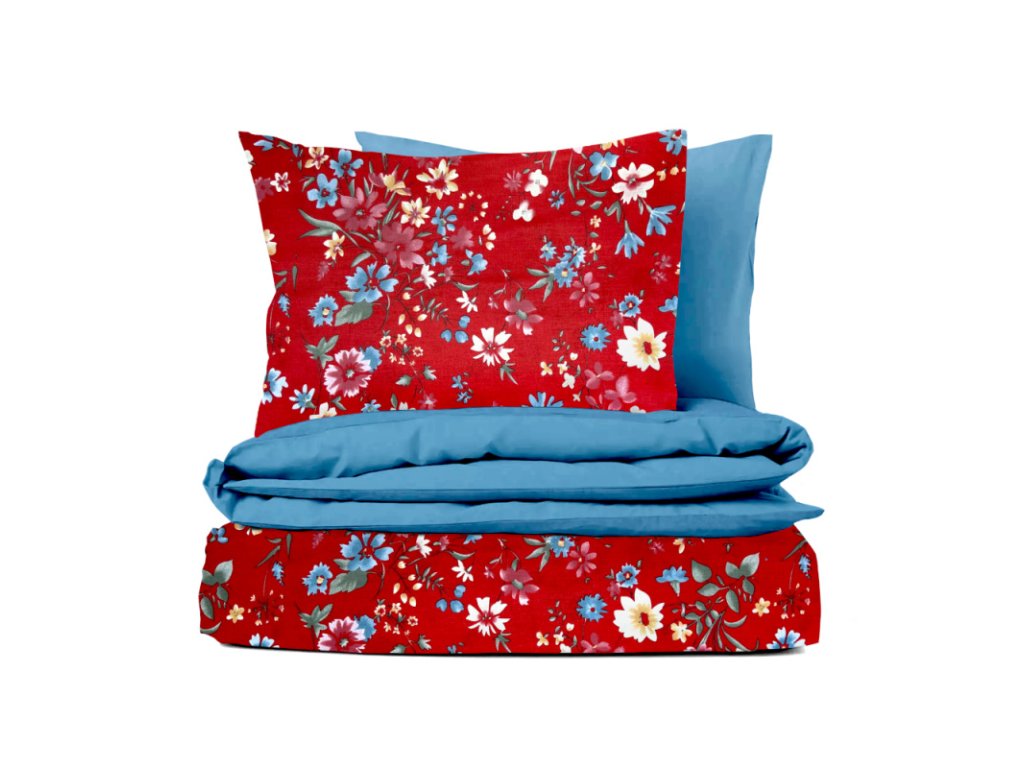 Toto povlečení je vyrobeno z kvalitní bavlny a je oboustranné. Jedna strana má design květinové louky s červeným podkladem a pestrými květinovými vzory, zatímco druhá strana je jednobarevná, modrá. Povlečení zahrnuje polštář a přikrývku, které jsou na obrázku složené. Tento produkt je zajímavý svou variabilitou a možností změny vzhledu ložnice podle nálady. Perfektní volba pro ty, kteří chtějí v ložnici čerstvý a přírodní vzhled.