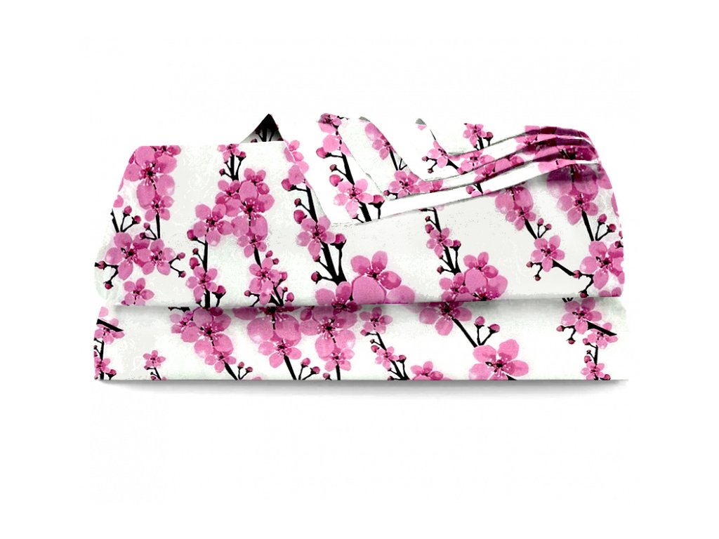 Toto bavlněné prostěradlo je bílé barvy s potiskem růžových květů sakury na černých větvičkách. Tento elegantní design přináší do vašeho interiéru nádech japonské estetiky a přírody. Prostěradlo je vyrobeno z kvalitní bavlny, která zaručuje pohodlný a příjemný spánek.