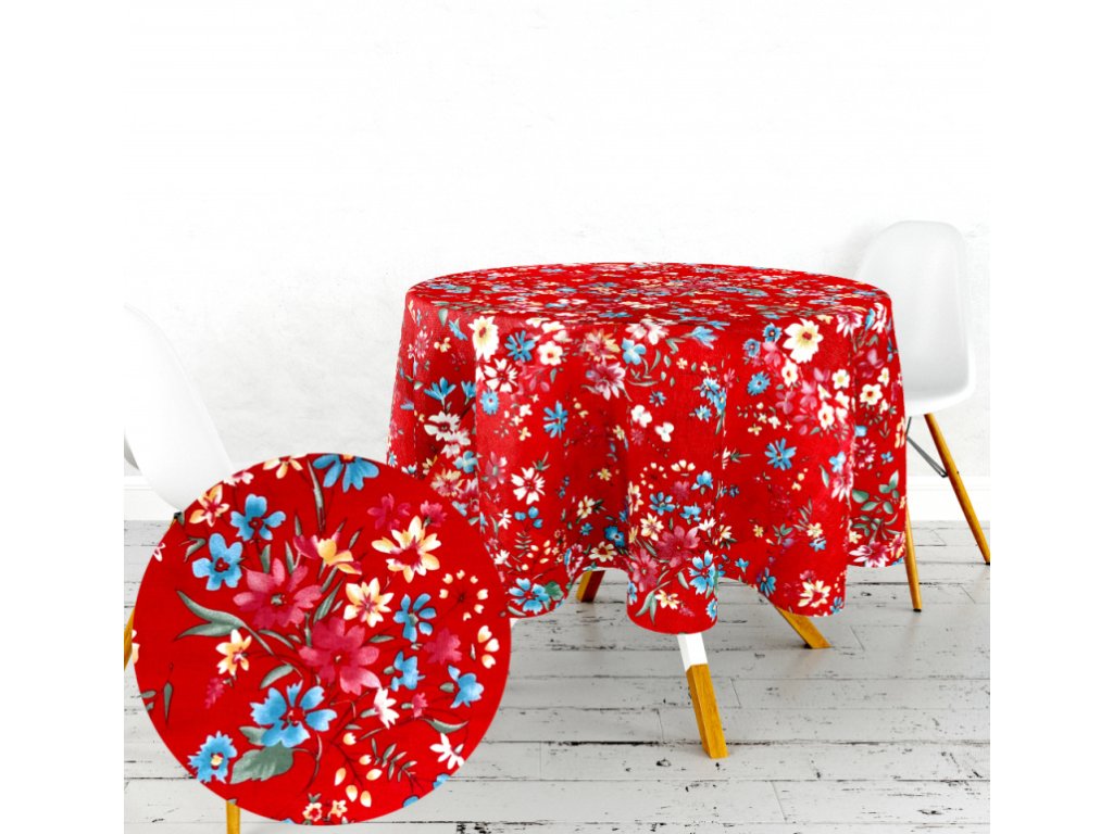 Tento ubrus je vyroben z kvalitní bavlny a je určen pro kulaté stoly. Má výrazný červený podklad s pestrým květinovým vzorem, který zahrnuje různé druhy květin v modrých, růžových, bílých a žlutých odstínech. Tento ubrus přináší do interiéru svěžest a barevnost, ideální pro jarní a letní období.