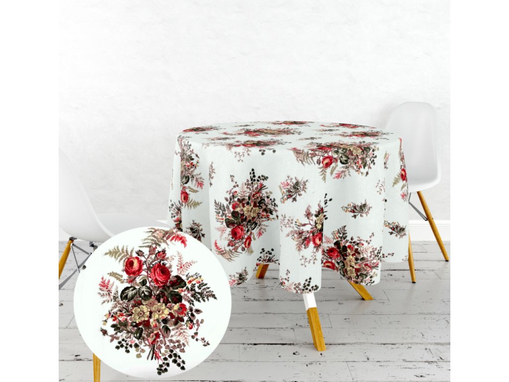 Ervi bavlněný ubrus na stůl kulatý - Růže a kapradí