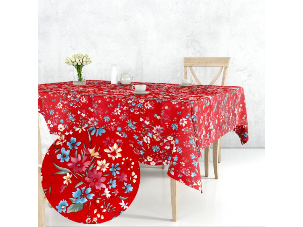 Tento ubrus je vyroben z kvalitní bavlny a má obdélníkový tvar. Jeho design je inspirován květinovou loukou, což je patrné z bohatého květinového vzoru na červeném pozadí. Ubrus je ideální pro oživení každého jídelního stolu a přidání barevného a veselého nádechu do vaší jídelny.
