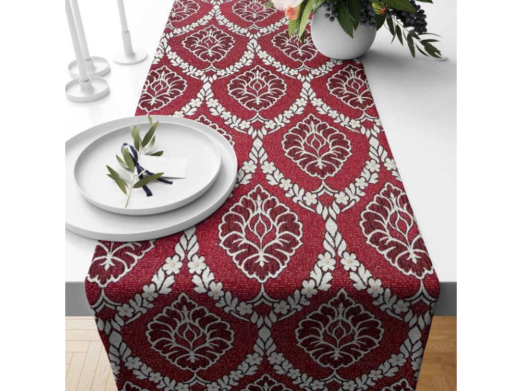 Jeho bordová barva s jemnými ornamenty vytváří harmonický a vkusný design, který se hodí jak do klasických, tak moderních interiérů. Díky preciznímu zpracování a detailnímu vzoru působí běhoun velmi exkluzivně a může být skvělým doplňkem pro slavnostní stolování, rodinné večeře nebo speciální příležitosti.