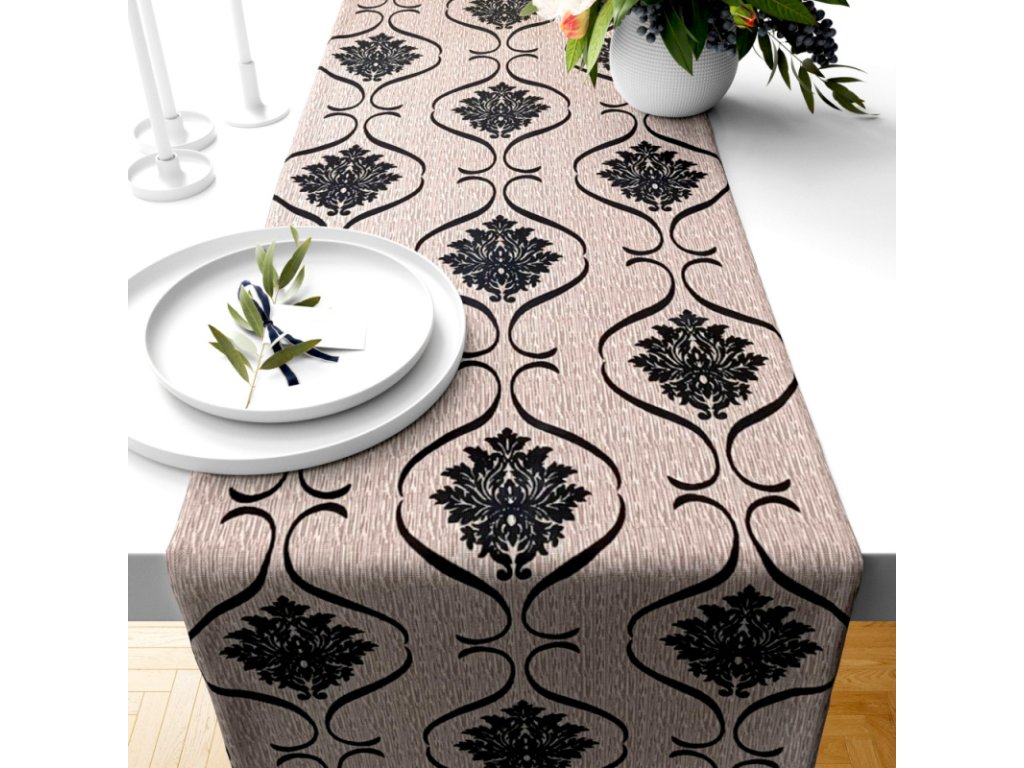 "Gobelinový běhoun na stůl Flok je elegantní doplněk, který dodá vašemu interiéru sofistikovaný vzhled. Tento běhoun je vyroben z kvalitního gobelínového materiálu, který zajišťuje pevnost a dlouhou životnost. Design běhounu zahrnuje jemné ornamentální vzory v černé barvě na béžovém podkladu, což vytváří atraktivní kontrast a luxusní vzhled. Ideální pro slavnostní příležitosti i každodenní použití, tento běhoun přidává vašemu stolu nádech elegance a stylu."