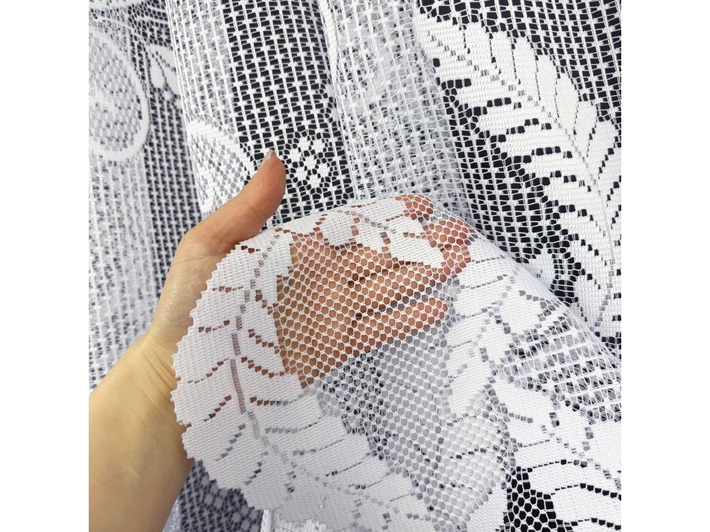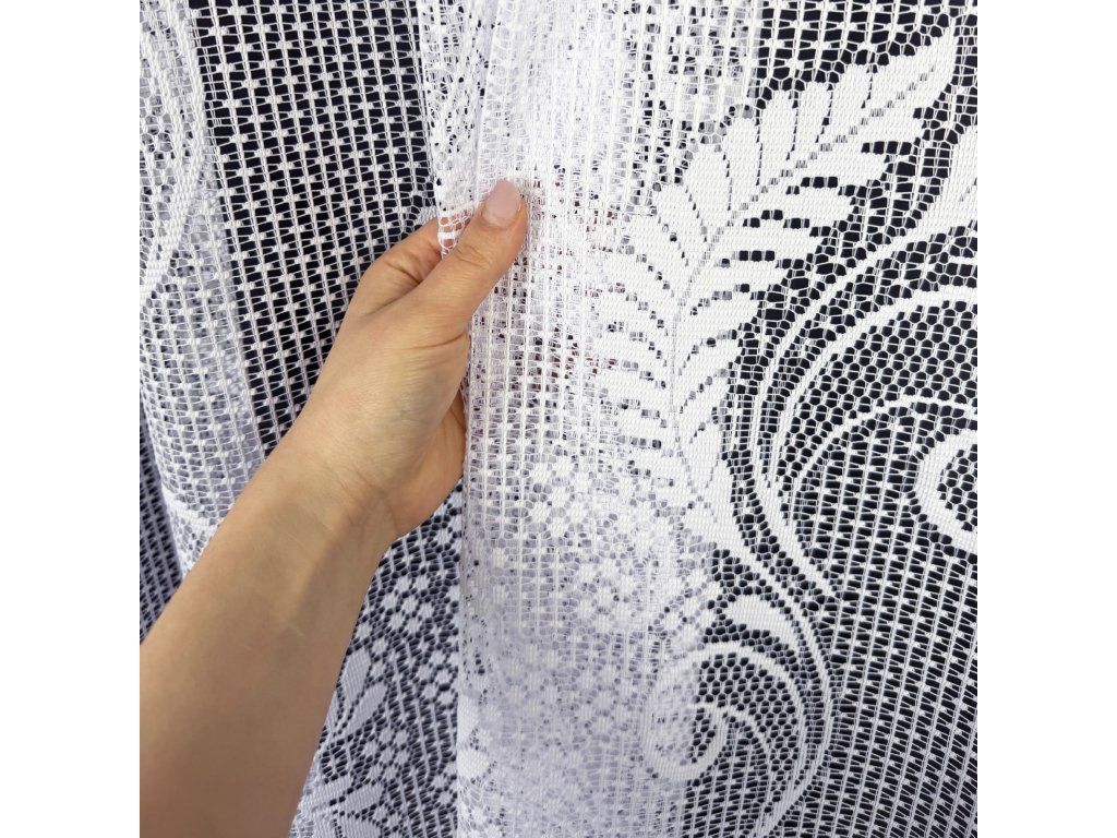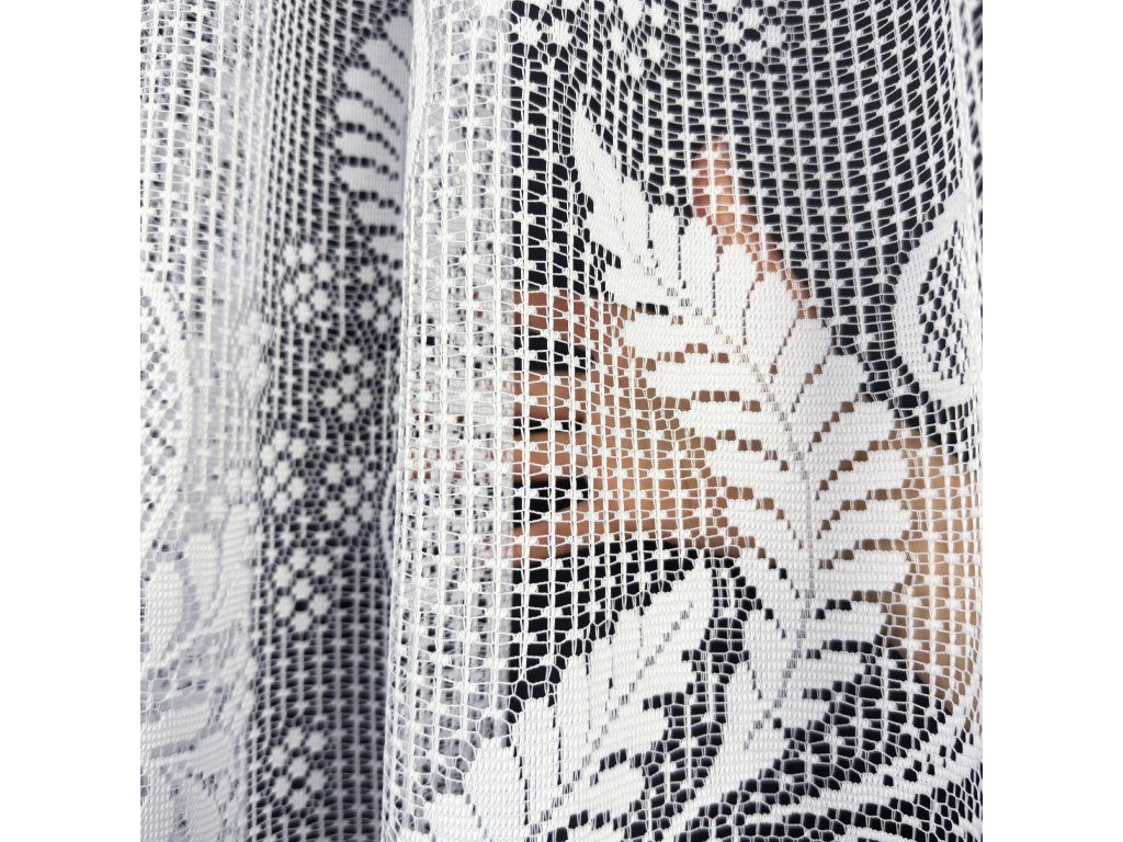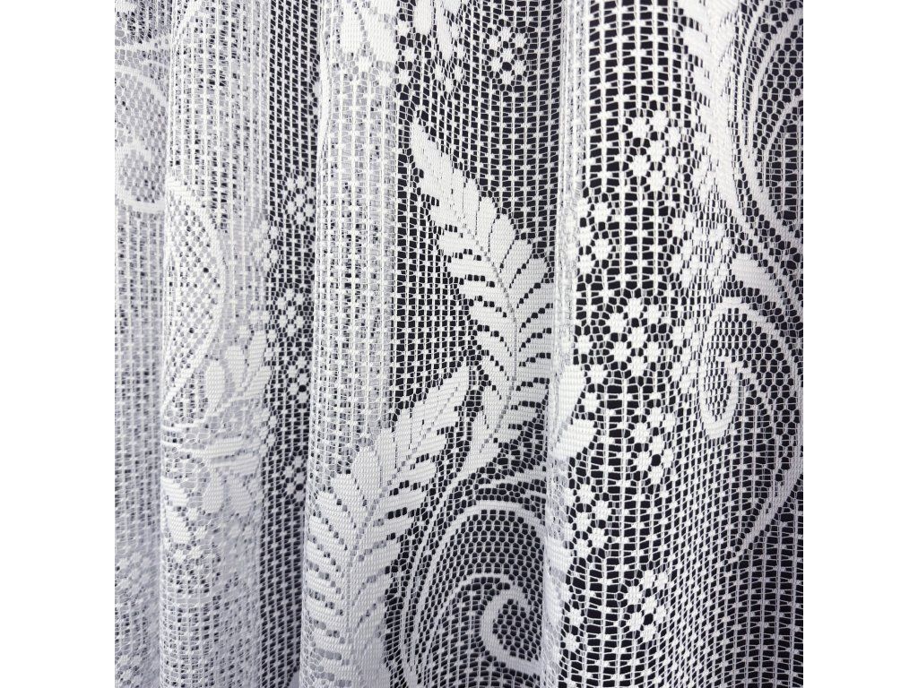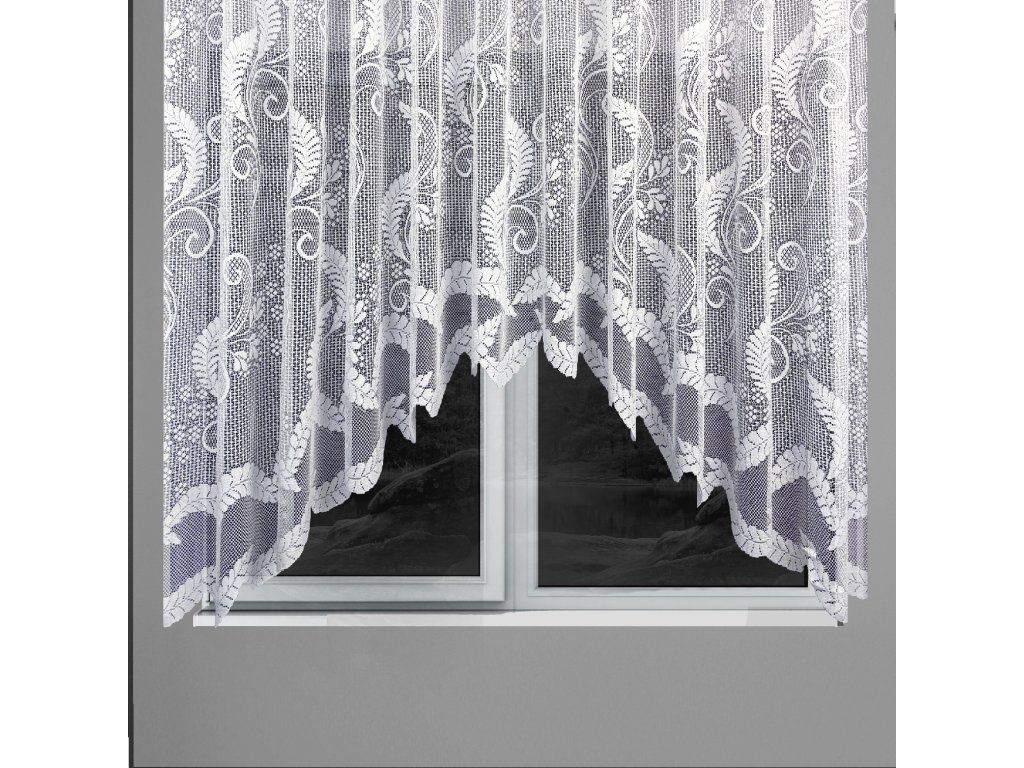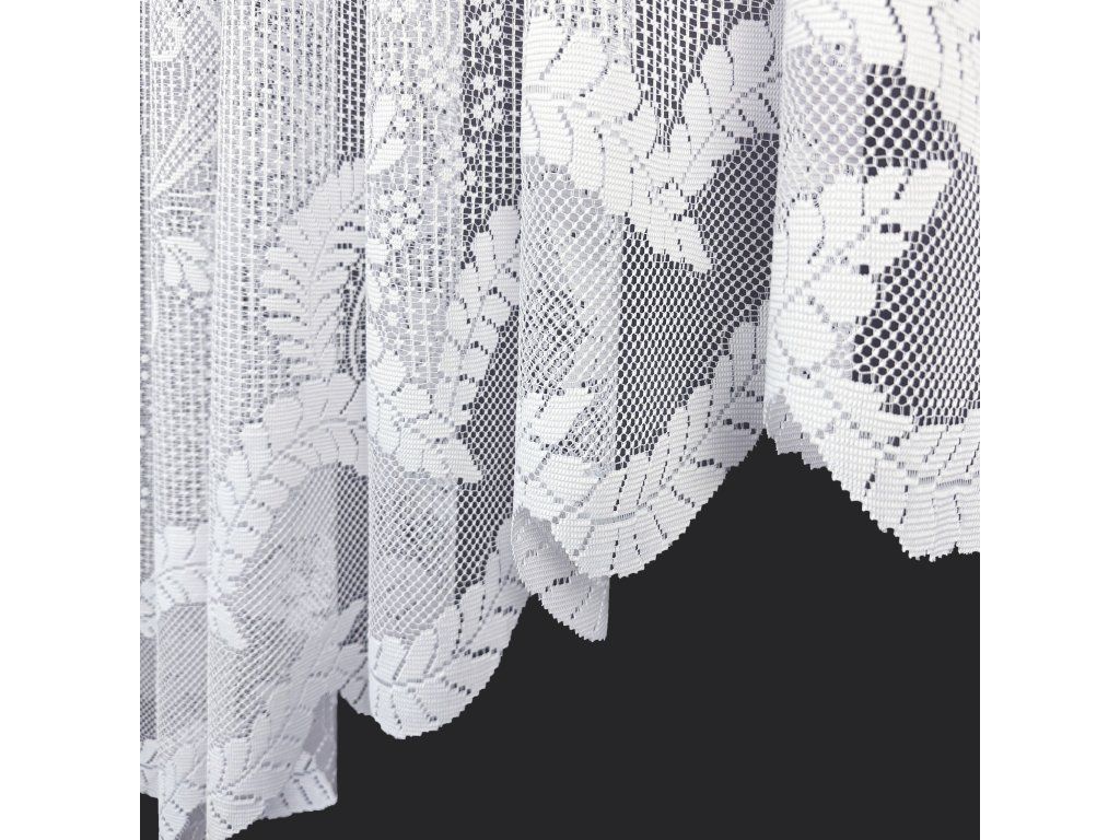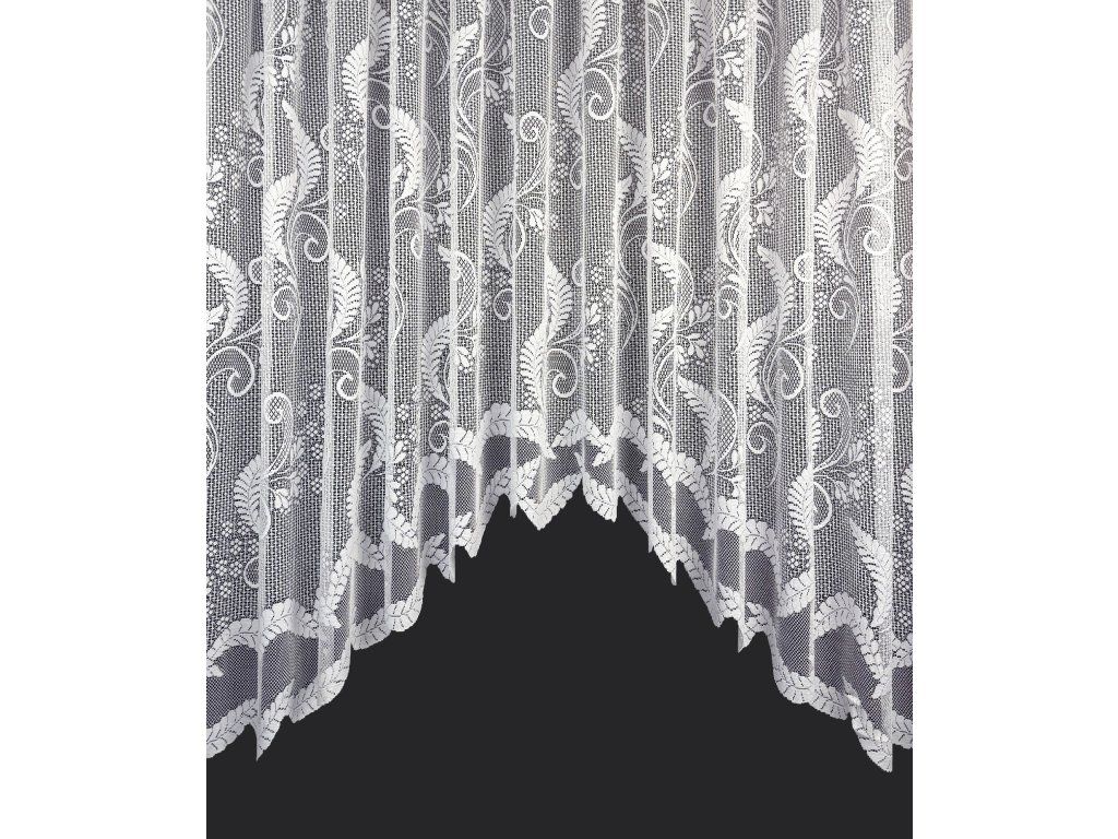 Zdobená žakárová záclona v bílé barvě tvarovaná do oblouku s našitou řasící páskou 2,5 cm.