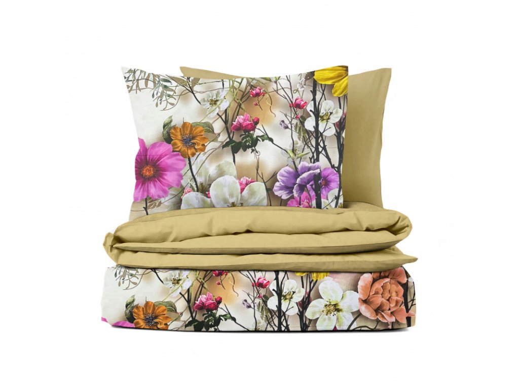 Ervi Bavlnené Saténové obliečky DELUXE DUO - Exotické kvety/olivové