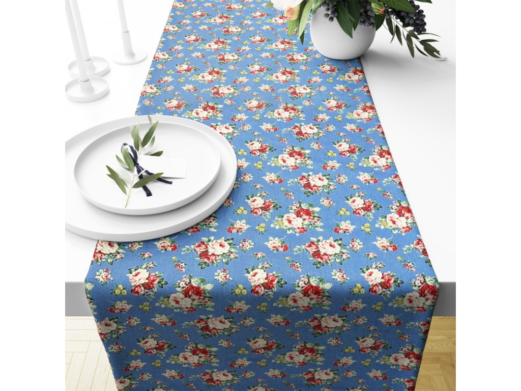 Ervi bavlnený behúň na stôl - ružičky na modrom