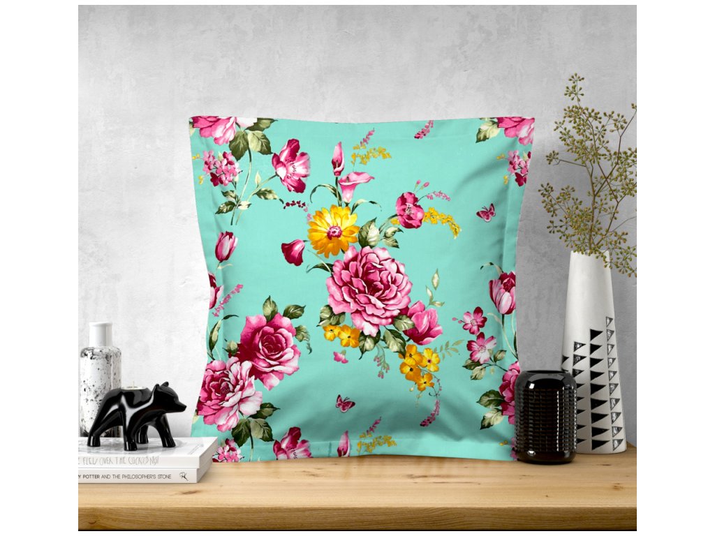 Ervi obliečka na vankúš bavlnený s lemom - Ružové kvety na tyrkysovom