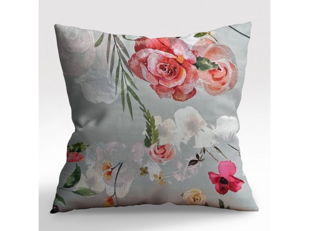 Ervi Saténová obliečka na vankúš DELUXE - Farebné kvety na šedom