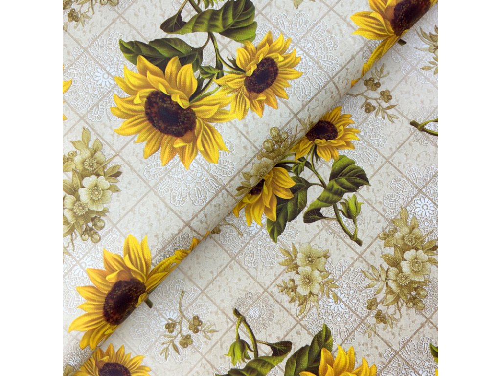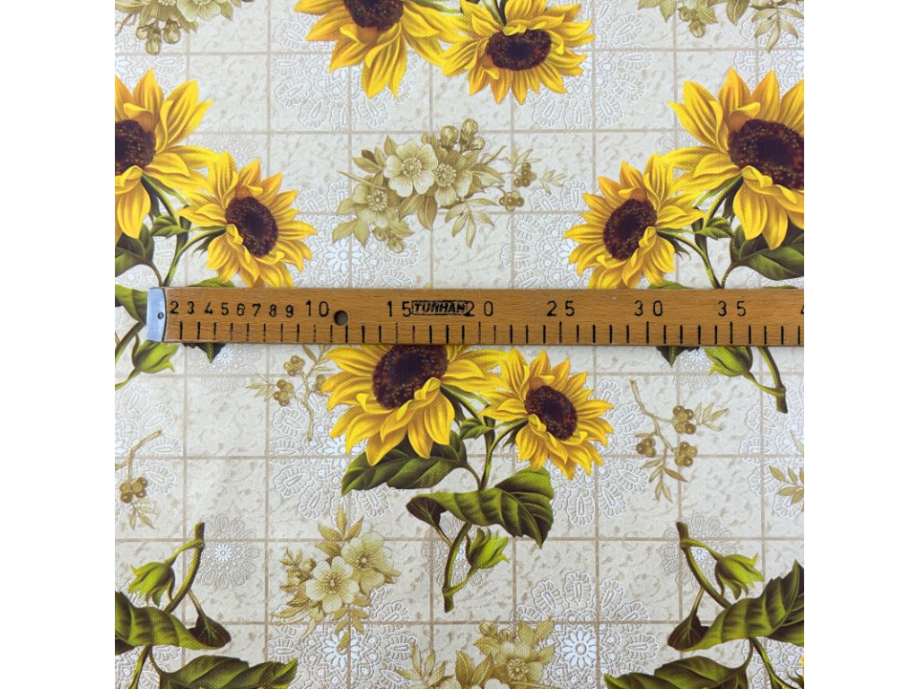 Omyvatelný PVC ubrus v šířce 140 cm se vzorem slunečnic. Z rubové strany je ubrus opatřen textilní vrstvou, která jej zpevňuje a zároveň zabraňuje klouzání ubrusu po stole.